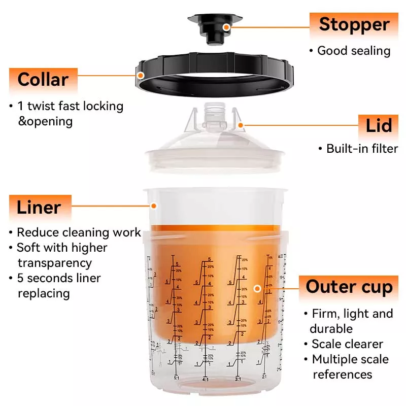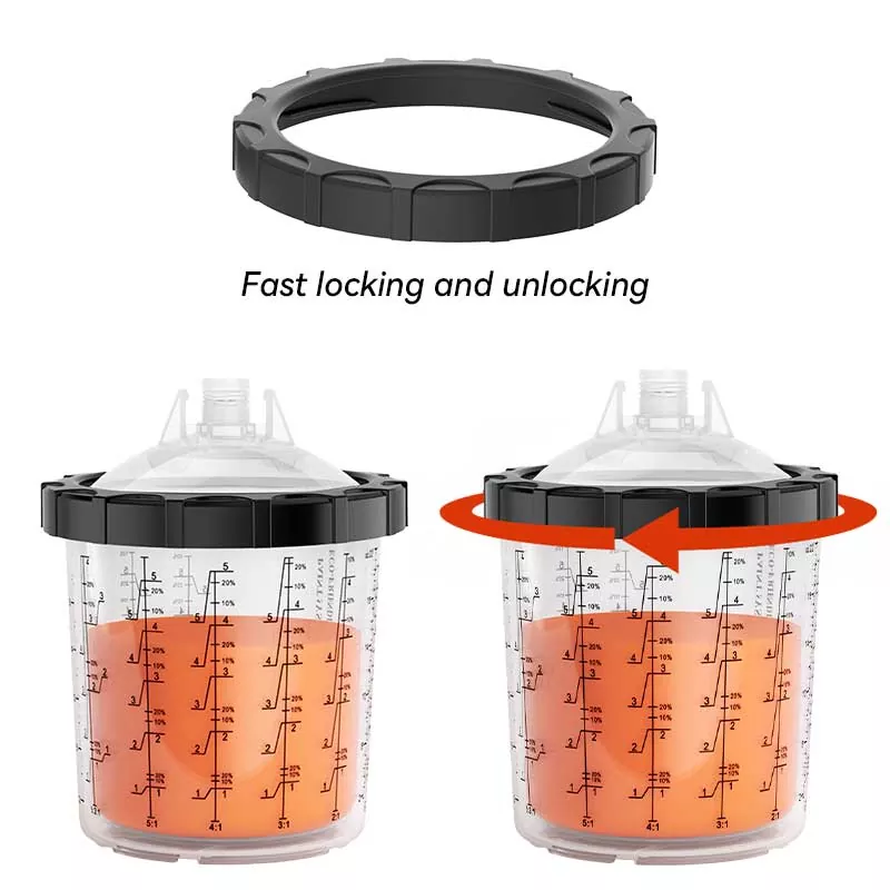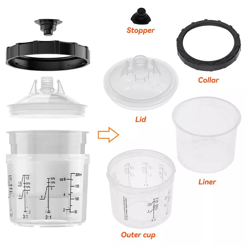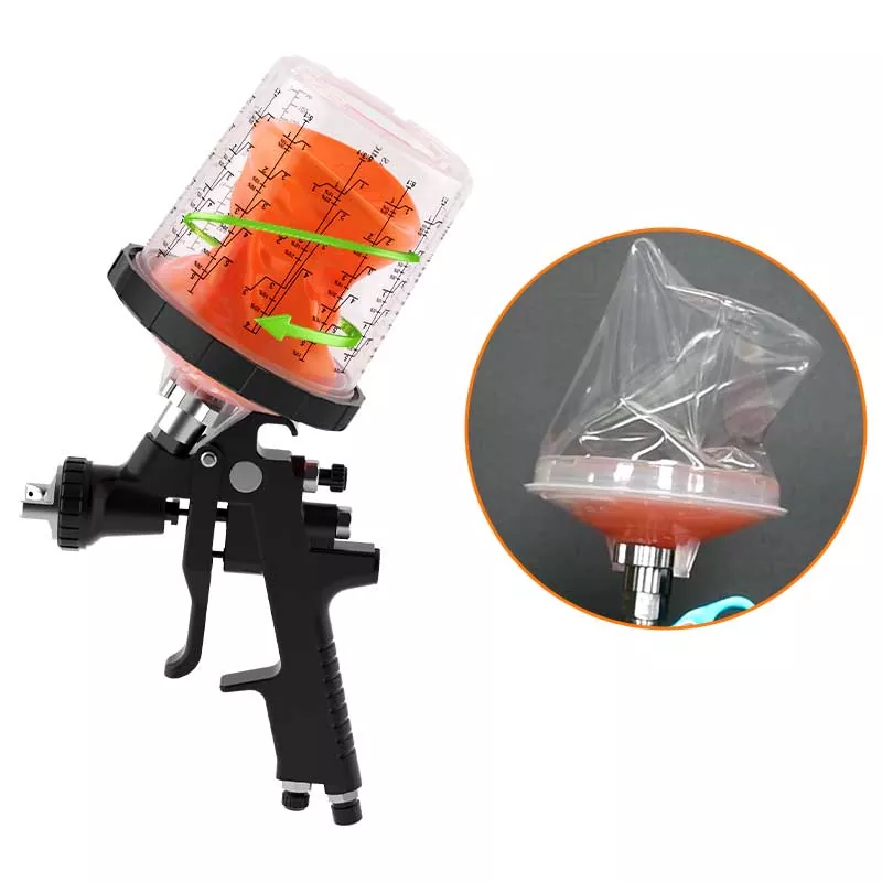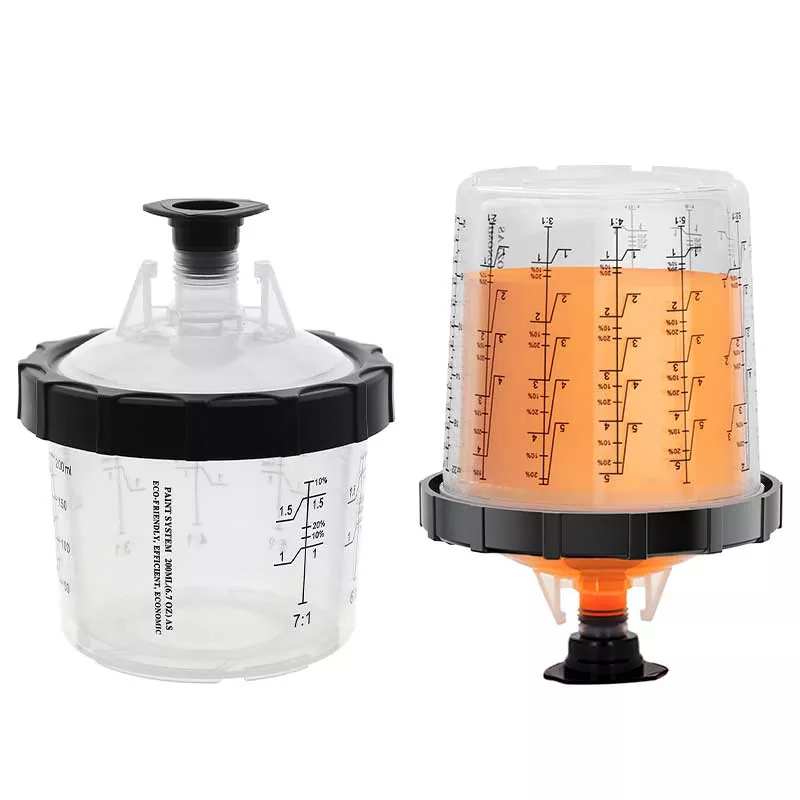 Ta 200 ML posodica za barvo za enkratno uporabo System 1.0 v bistvu nadomešča tradicionalne posodice z gravitacijskim podajalnikom, ker ne le prihrani več barve, ampak tudi izboljša učinkovitost barvanja. Natančneje, izvrstna zasnova samodejnega spiralnega spuščanja podloge pri barvanju omogoča popolno izrabo barve; medtem pa zasnova s hitrim zaklepanjem in zamenjavo obloge preprečuje pranje skodelice, kar omogoča učinkovito in večkratno izvedbo barvanja. Imamo adapterje za skoraj vse znamke brizgalnih pištol na trgu, da bi zadovoljili izkušnje različnih navdušencev nad brizgalnimi pištolami. Adapter je izdelan iz nerjavečega jekla, ki je odporno proti koroziji barve in zelo vzdržljivo. Tesna kombinacija obloge s pokrovom zagotavlja, da sistem skodelic ne pušča barve med barvanjem, in podpira dolgoročno shranjevanje neuporabljene barve, da se izognete odpadku.