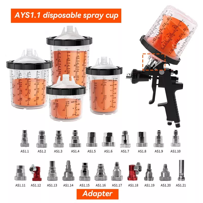 Pršilna skodelica AYS1.1 za enkratno uporabo je združljiva z adapterjem serije PPS1.0. Z adapterjem se lahko popolnoma prilagodi kateri koli znamki brizgalne pištole in se lahko uporablja v katerem koli položaju brez nevarnosti kapljanja barve.