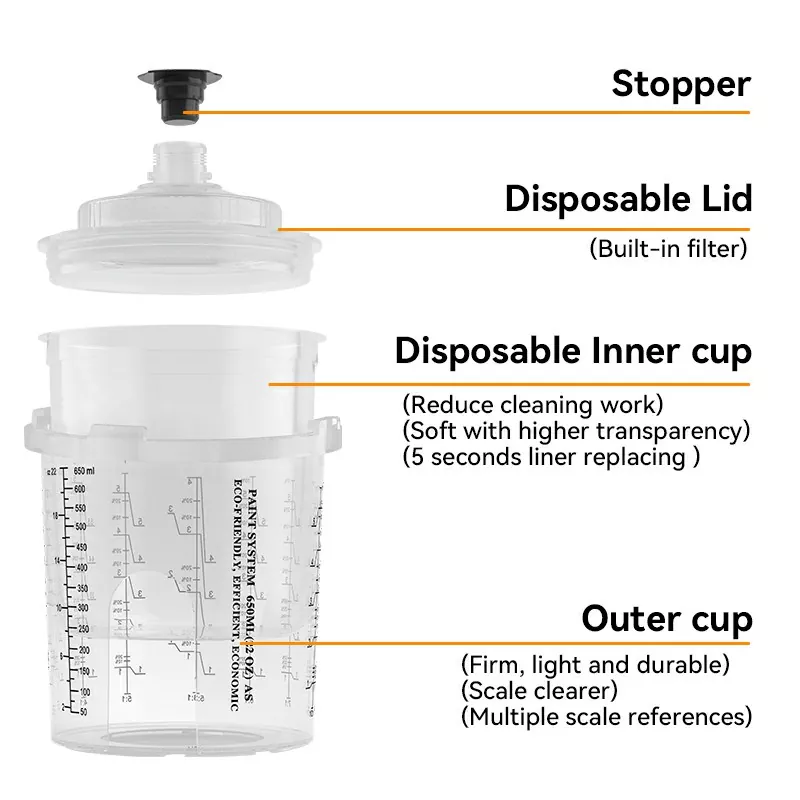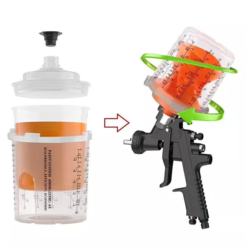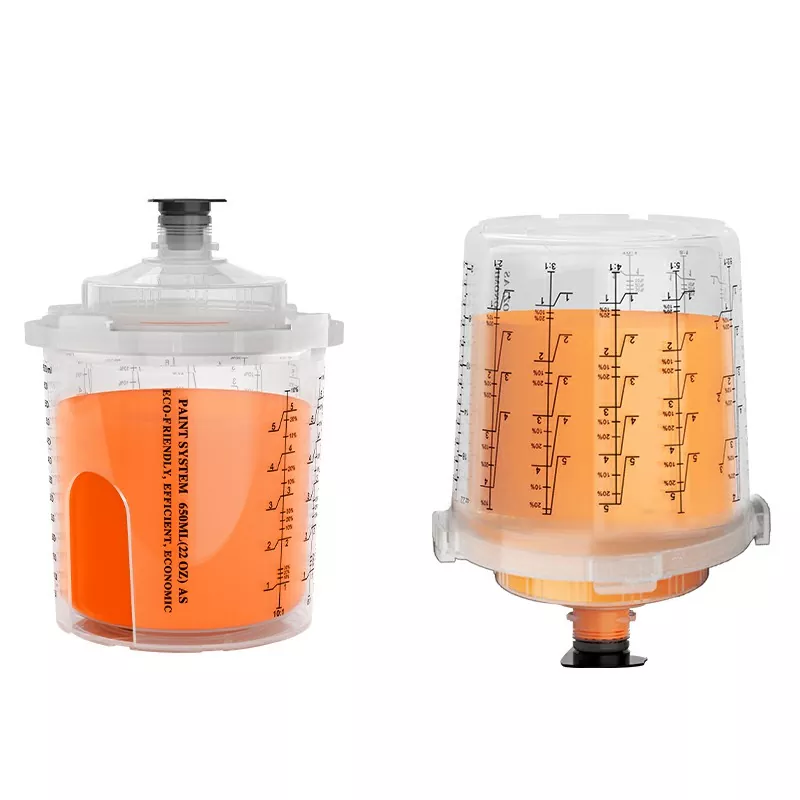 650ml skodelice za razpršilno pištolo za enkratno uporabo odlikuje integriran dizajn Snap-on na zunanjem robu skodelice. Pokrov se zaklene na zunanjo skodelico, tako da jo zasuka 1/4 zavoja v smeri urinega kazalca, kar še zmanjša čas, ki je potreben za spremembo notranje skodelice. Zaradi tega so še posebej primerni za večbarvno brizganje, izboljšanje učinkovitosti sprememb barve barve. Zasnova brez ovratnikov odpravlja tudi možnost, da skodelica postane neuporabna zaradi izgubljenega ovratnika.