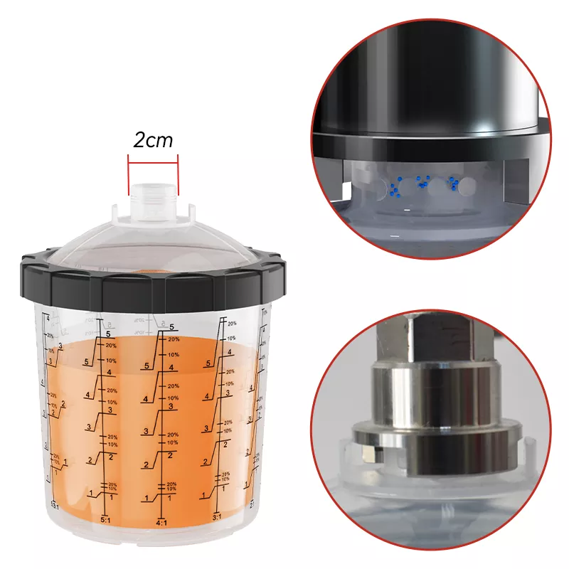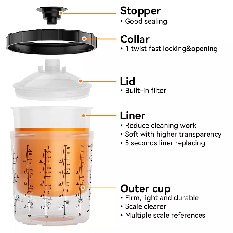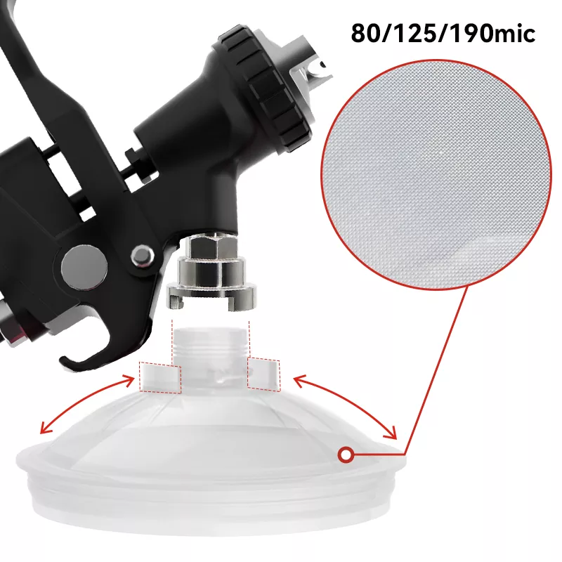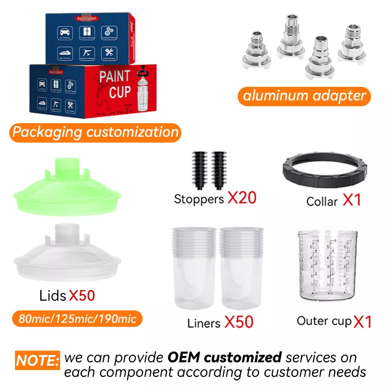 650ML Speedy Paint System 2.0 je nova vrsta sistema posod za barvo v spreju za enkratno uporabo. Ena škatla vključuje [1 zunanjo skodelico + 1 ovratnik + 50 oblog + 50 pokrovov + 20 zamaškov], ki podpira več barv barve v enem nanosu. Za različne velikosti delcev barve so na voljo mrežice filtrov 80, 125 in 190 mikrometrov, kar omogoča izbiro ustreznega filtra. Sistem lončkov za pršenje barve za enkratno uporabo lahko deluje tudi kot enota za mešanje in shranjevanje barve, tako da ni več treba uporabljati papirnatih lijakov in mešalnih lončkov, kar omogoča štiri funkcije v enem: filtriranje, mešanje, pršenje in shranjevanje barve. Zato je ljubiteljem slikanja ta izdelek tako všeč.