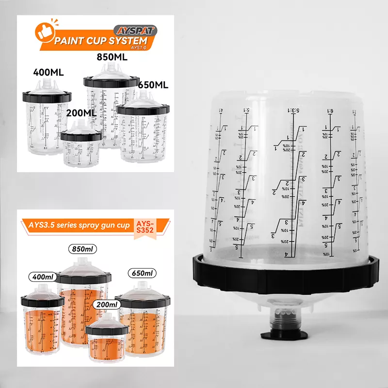 Po nenehnih prizadevanjih je Qingdao Aspaint lansiral svoj novi patentirani izdelek – 650 ml Speedy Paint System 2.0. Razširjena šoba in nova oblika vodilne ograje na pokrovu podpirata bolj priročno in učinkovito barvanje. Zunanja skodelica in kartonska embalaža podpirata prilagojen logotip, ki povečuje vpliv vaše blagovne znamke. Poleg tega ponujamo tudi velikosti 200 ml, 400 ml in 800 ml za različne situacije in potrebe pleskarjev. Uporabite vsak del barve, da dosežete nič odpadkov pri pleskanju!
